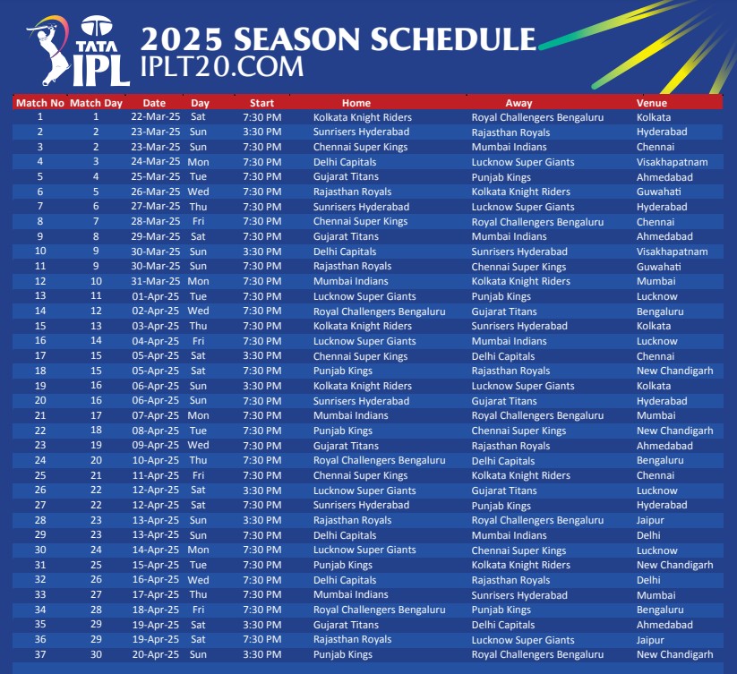 IPL 2025 போட்டிகளுக்கான அட்டவணை வெளியீடு !