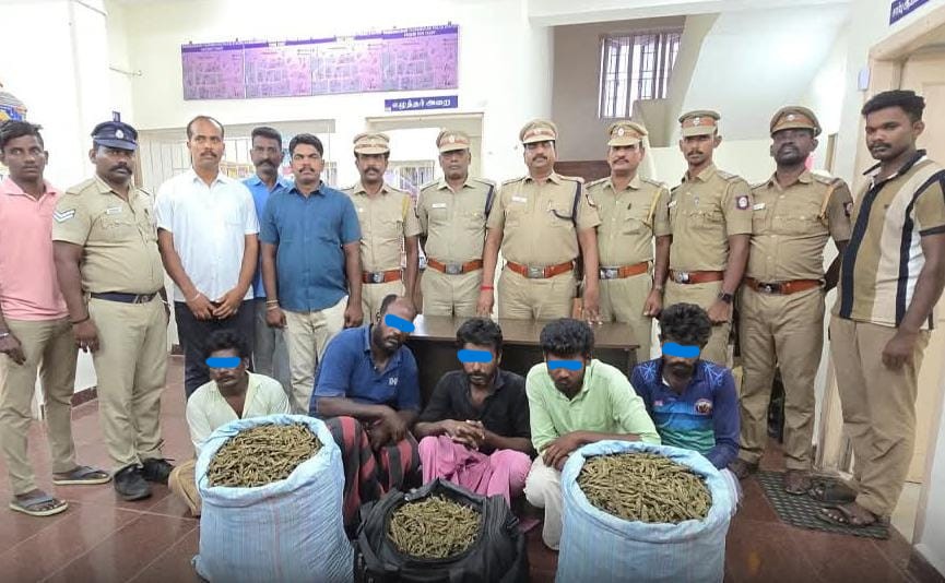 ராமேஸ்வரம் மீன்பிடி துறைமுகத்திலிருந்து இலங்கைக்கு கடத்துவதற்காக காரில் பதுக்கி வைக்கப்பட்டிருந்த சுமார் 10 லட்சம் மதிப்புள்ள 50 கிலோ கஞ்சாவை தனிப்பிரிவு போலீசார் அதிரடியாக கைப்பற்றியுள்ளனர். இந்த நடவடிக்கையில், கஞ்சா கடத்தலில் ஈடுபட்ட 6 பேர் கைது செய்யப்பட்டுள்ளனர்.